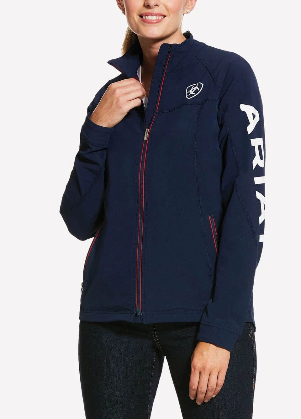The Ariat Women’s Softshell Jacket further has convenient zippered pockets and Ariat branding. The Agile Softshell is available in the stylish Team colourway of navy with red and white detailing.