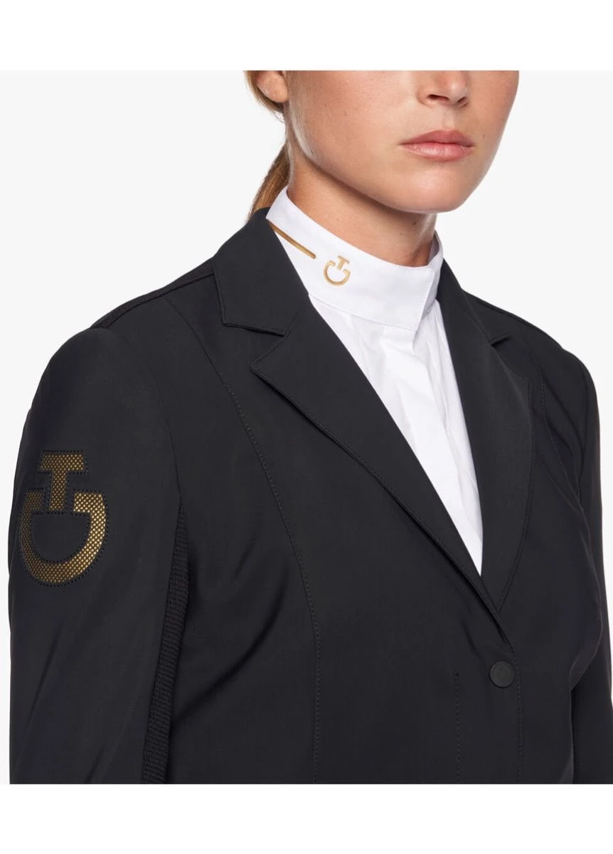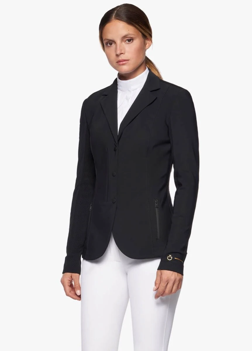 This REVOLUTION riding jacket features a double fabric construction. Sensitiveยฎ Fabrics join the technical 3D knits to create a garment with extremely elegant appeal and greatest comfort. Conceived for being extremely performant while riding, the jacket provides high breathability, acting on your body like second skin without preventing your movements. The garment features a technical knit insert on back and arms for optimal humidity control, while the front part is made from water repellent fabric with thermo-dynamic lining to protect you from wind and rain. This jacket features a practical zip and buttons fastening, two zip front pockets and an embroidered logo on the shoulder.