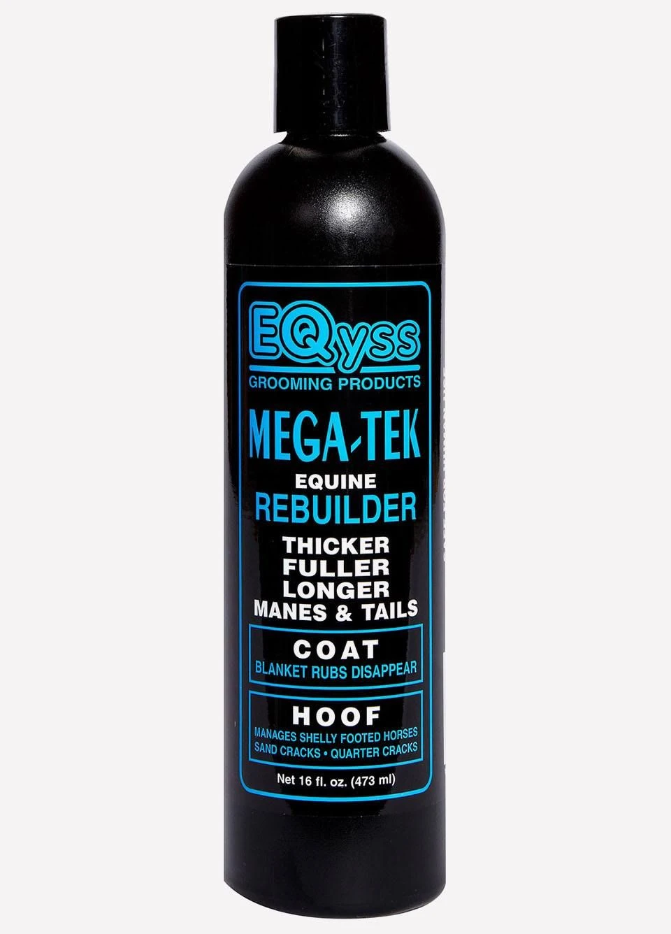 The EQyss Mega Tek Rebuilder strengthens without the use of synthetic polymers, oils, or petroleum based products. Strengthens coat hair and manes and tails. Encourages robust re-growth in areas effected by scaring and rubs – esp winter rug rubs on shoulders, withers and boot rubs. Also makes hooves grow faster and makes them 30% stronger.