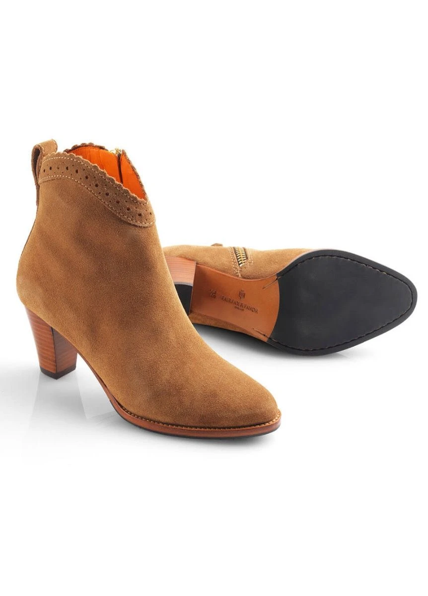 Taking some of the most distinguishable elements of our definitive tall boot, the Regina Ankle draws from our timeless piece, whilst retaining individuality. This Ankle boot is, in comparison, designed with a more elegant arched block heel and pointed toe, yet retains the wooden /rubber sole and scalloped design edging. With signature shield detailing on the rear pinch tab, the Regina Ankle can be slipped on easily – finishing an outfit, whilst drawing on the classic features of our iconic knee-high boot.