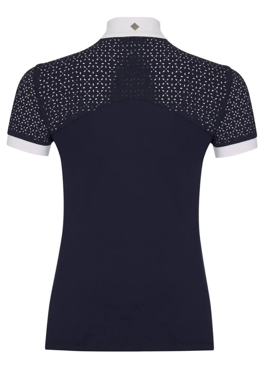 Delicate, laser-cut lace sleeve and back detail provides subtle beauty while also allowing air flow through the shirt to regulate heat and moisture