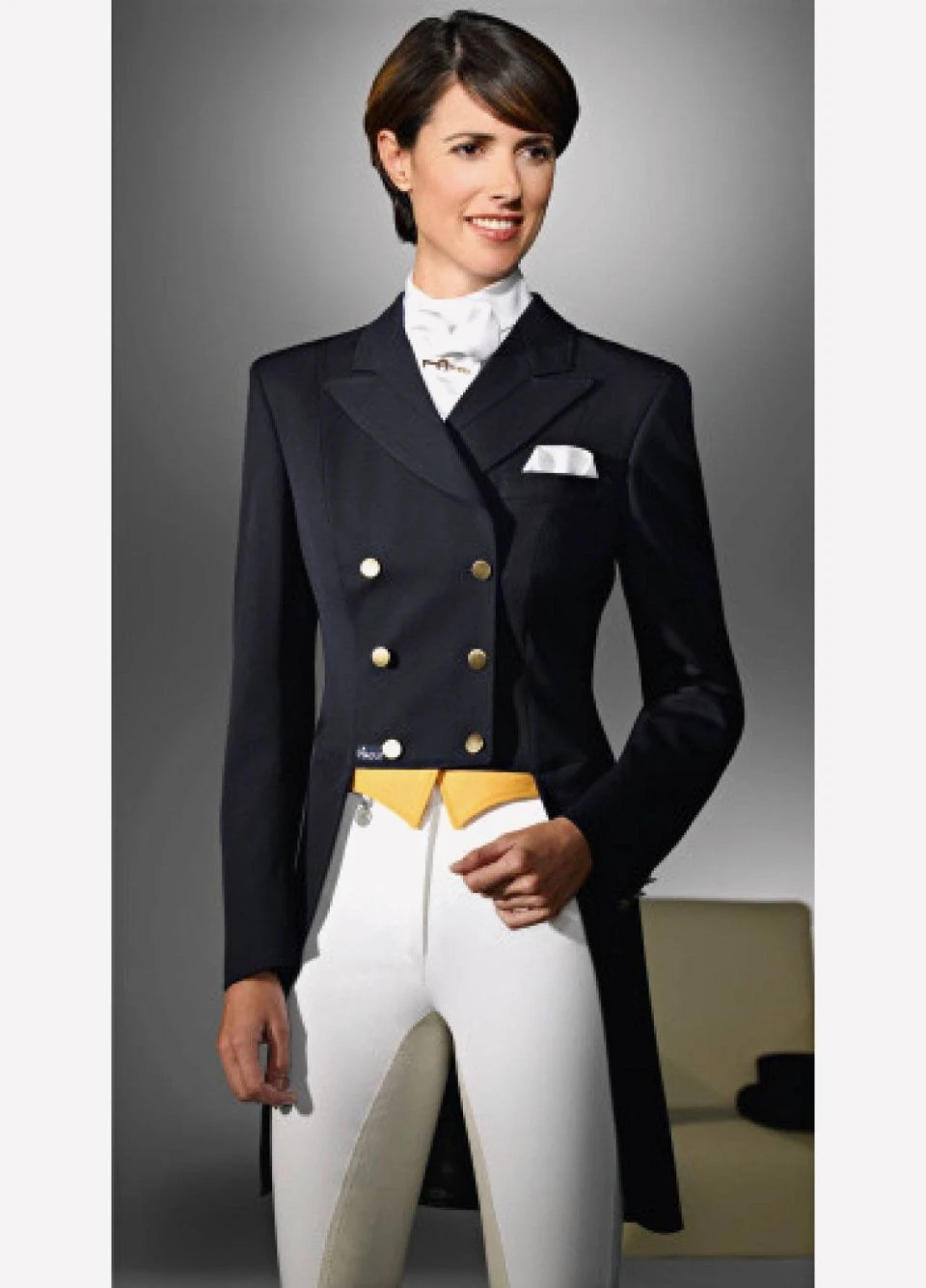 Simply wow the competition with this elegant tailcoat jacket from Pikeur. The navy colour looks oh so smart with crisp white breeches and gloves, and is perfect for adding the finishing detail to a dazzling dressage test. Theย tailcoat has traditional canary points, with gold buttons and weights in the tails to hold them down. It also features a lovely chest pocket, and the embroidered PIkeur logo above the front hem.ย
